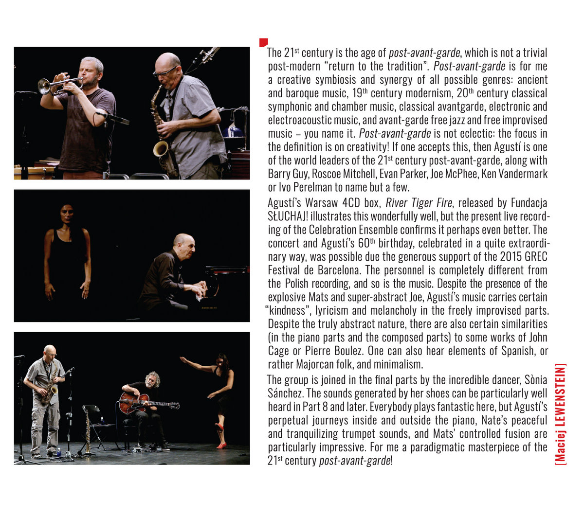 Agustí’s Warsaw 4CD box, River Tiger Fire, released by Fundacja Słuchaj! illustrates this wonderfully well, but the present live recording of the Celebration Ensemble confirms it perhaps even better. The concert and Agustí’s 60th birthday, celebrated in a quite extraordinary way, was possible due the generous support of the 2015 GREC Festival de Barcelona. The personnel is completely different from the Polish recording, and so is the music. Despite the presence of the explosive Mats and super-abstract Joe, Agustí’s music carries certain "kindness", lyricism and melancholy in the freely improvised parts. Despite the truly abstract nature, there are also certain similarities (in the piano parts and the composed parts) to some works of John Cage or Pierre Boulez. One can also hear elements of Spanish, or rather Majorcan folk, and minimalism.